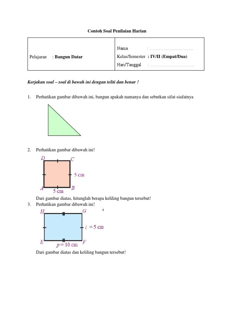 Bangun datar tersebut dapat dibagi menjadi beberapa jenis yaitu persegi panjang, trapesium, lingkaran, persegi, jajar genjang, belah ketupat, segitiga, dan layang layang. Selamat datang di pakdosen co id web digital berbagi ilmu pengetahuan. (iv) tidak mempunyai simetri lipat. Berikut ini adalah penjelasan lebih lengkap disertai dengan contoh soal. Sebuah taman berbentuk persegi dengan luas 64 m 2. Sehingga keliling pada bangun datar sendiri adalah kumpulan garis yang membentuk bangun tersebut. Luas sebuah persegi panjang sama dengan luas persegi yang panjang sisinya 20 cm. Sebelum mengerjakan latihan soal berikut ini. Menghitung keliling persegi dengan cara mengalikan 4 sisinya. Setiap bangun 2 dimensi tersebut bisa kita cari luas dan kelilingnya dengan menggunakan rumus tertentu. Keliling gabungan bangun datar yang terdiri dari bangun segitiga dan persegi panjang tersebut dapat ditentukan sebagai berikut. Bagi anda yang belum tahu, arti keliling adalah garis yang membatasi suatu bidang. Soal sudah dilengkapi kunci jawaban serta pembahasan.